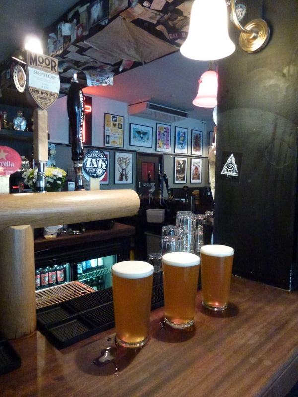 In contrast, Camden Town Brewery, ten minutes walk north, was humming. This was the first time I’d made it to the brewery’s bar, which has been opening to the public on Fridays for a while now but has only recently started opening daily. With the brewery’s Twitter stream indicating that the keg version of its special Olympics-themed 1908 Pale Ale (the previous London games was held in that year) was running out fast there was no choice as to our first tipple. Inspired by recipes of the time dug up by brewing historian Ron Pattinson (whose Shut Up About Barclay Perkins blog is a must read for beer lovers) 1908 (5% in draught form) was crisp, well-hopped, hazy bronze and classically English. Despite being keg and using some American hops in addition to Goldings (CAMRA again take note!) I should have bought a bottle for later.