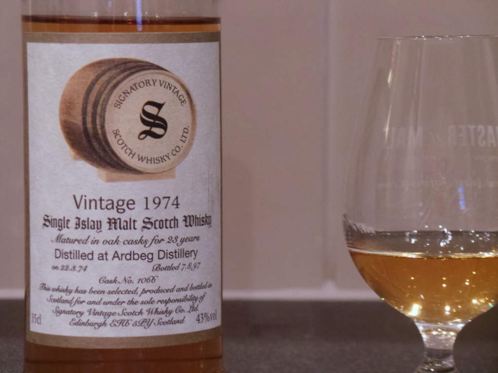 * Signatory Ardbeg Vintage 1974, 23 Years Old, cask no. 696 (53%) – from a sister cask to the half bottle.